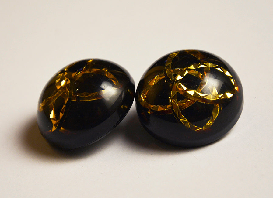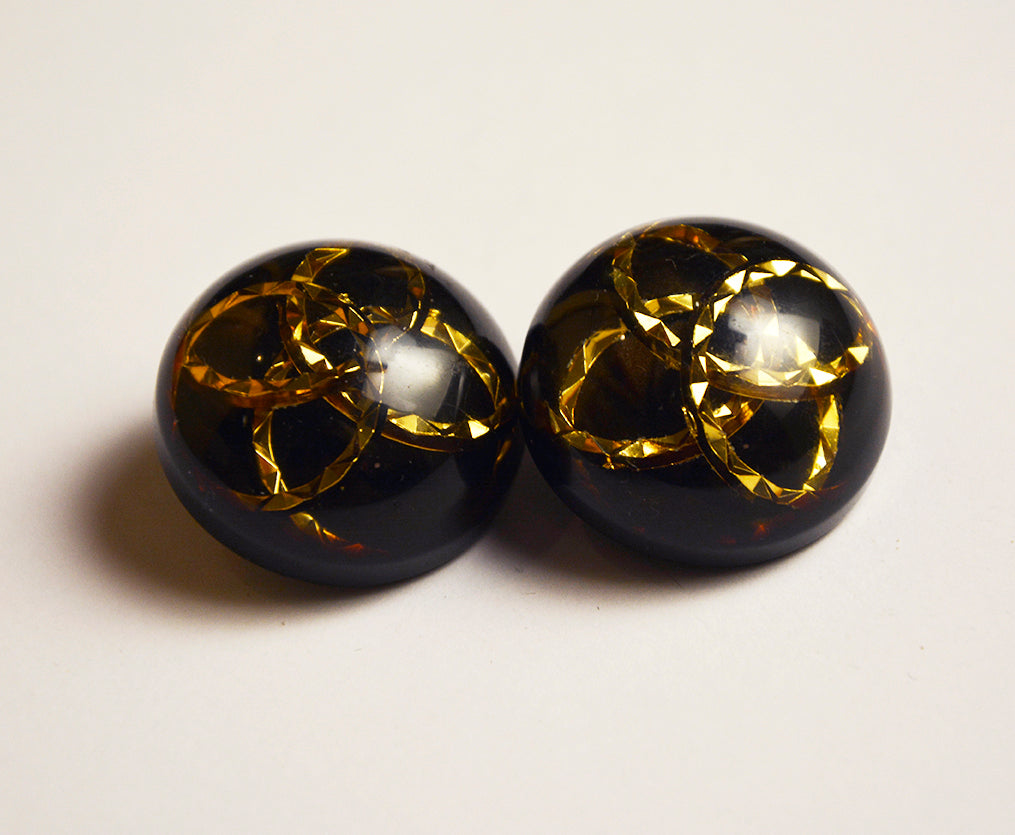 Puolipallon muotoinen nappi. Napin sisällä neljä kultaista rengasta. Halkaisija 3cm, korkeus 1,5cm.