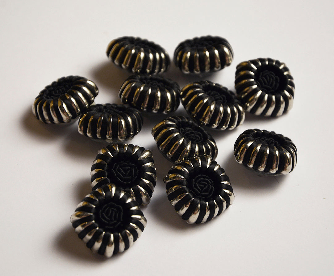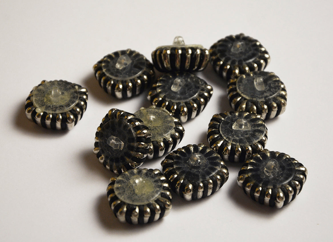 Hopean ja mustan värinen nappi. Halkaisija 3cm, korkeus 1,5cm.