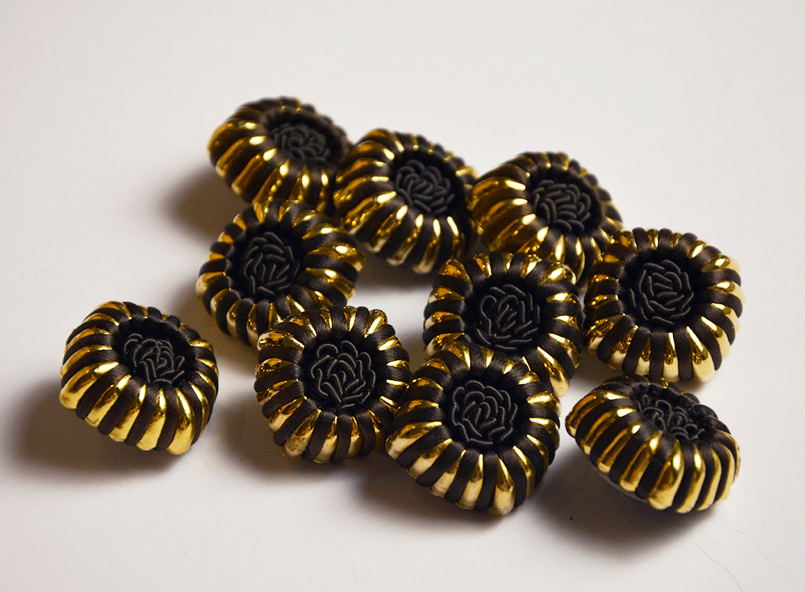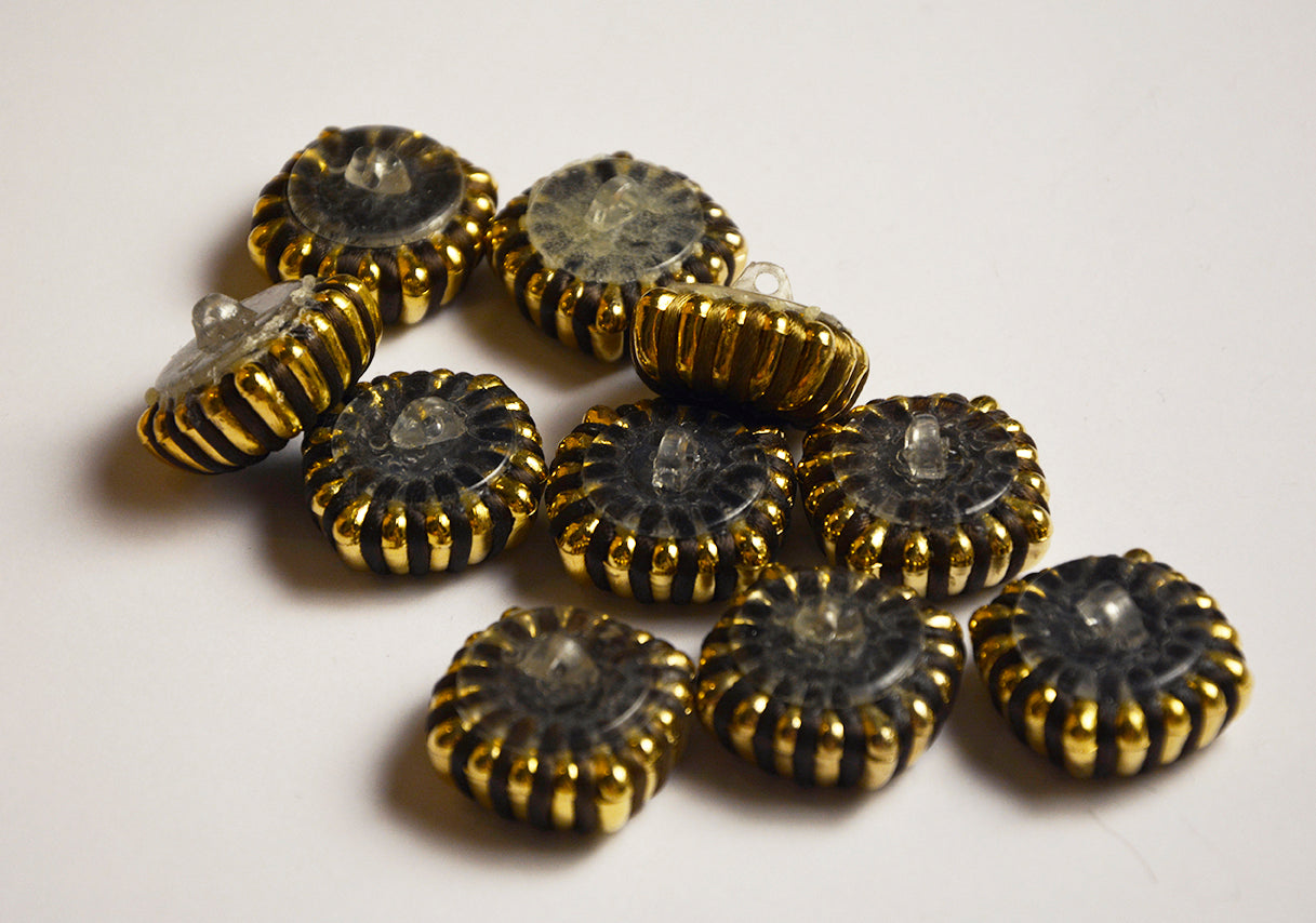 Kullan ja ruskean värinen nappi. Halkaisija 3cm, korkeus 1,5cm.