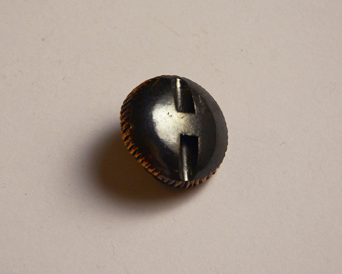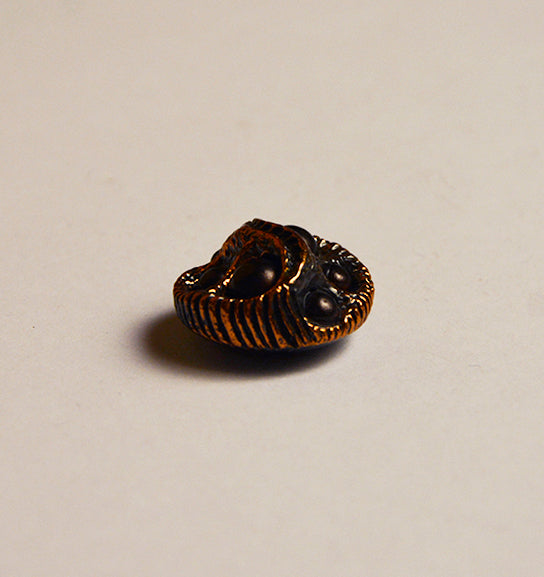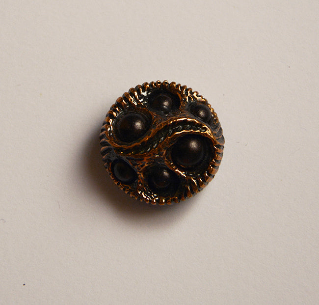 Kuparin värinen nappi. Halkaisija 2,2cm, korkeus 1,5cm.