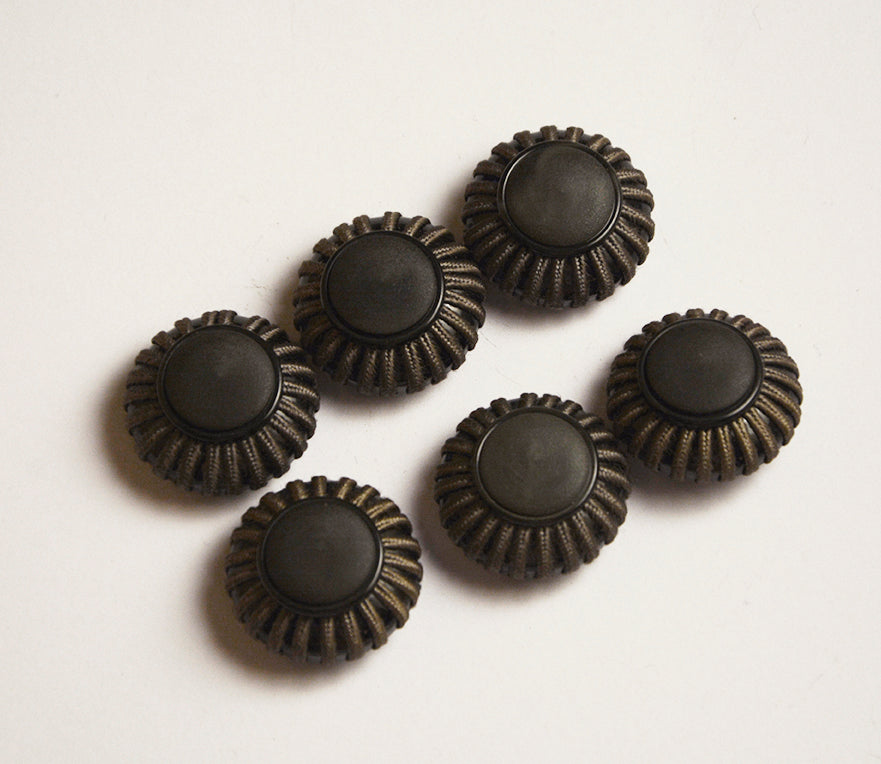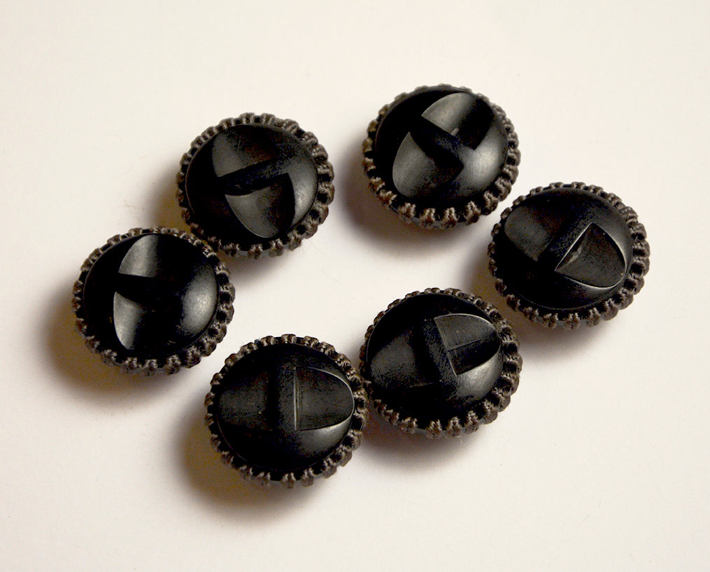 Ruskean ja mustan värinen nappi. Halkaisija 2,5cm, korkeus 1,5cm.