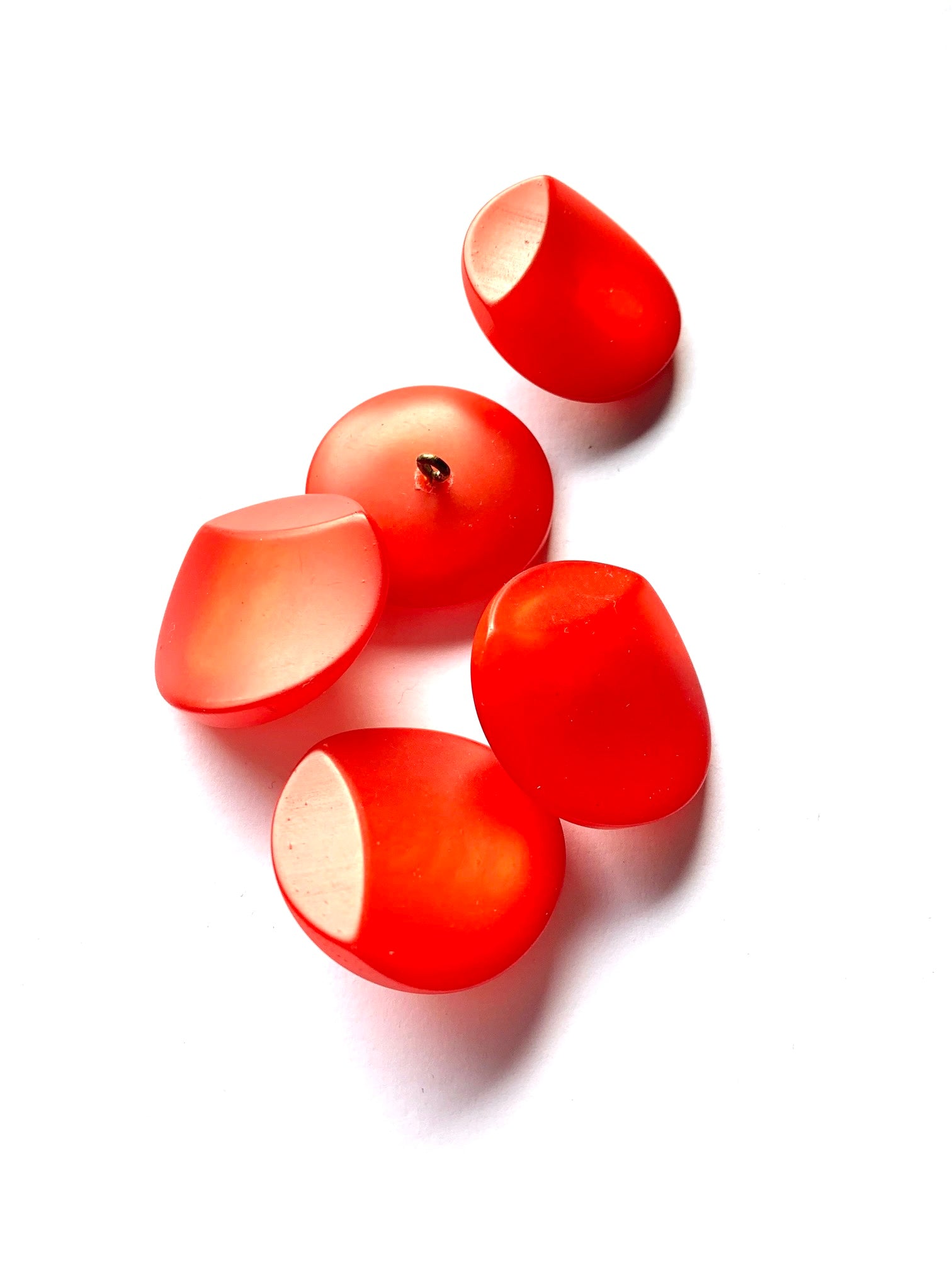 Punainen muovinappi. Halkaisija 3 cm.