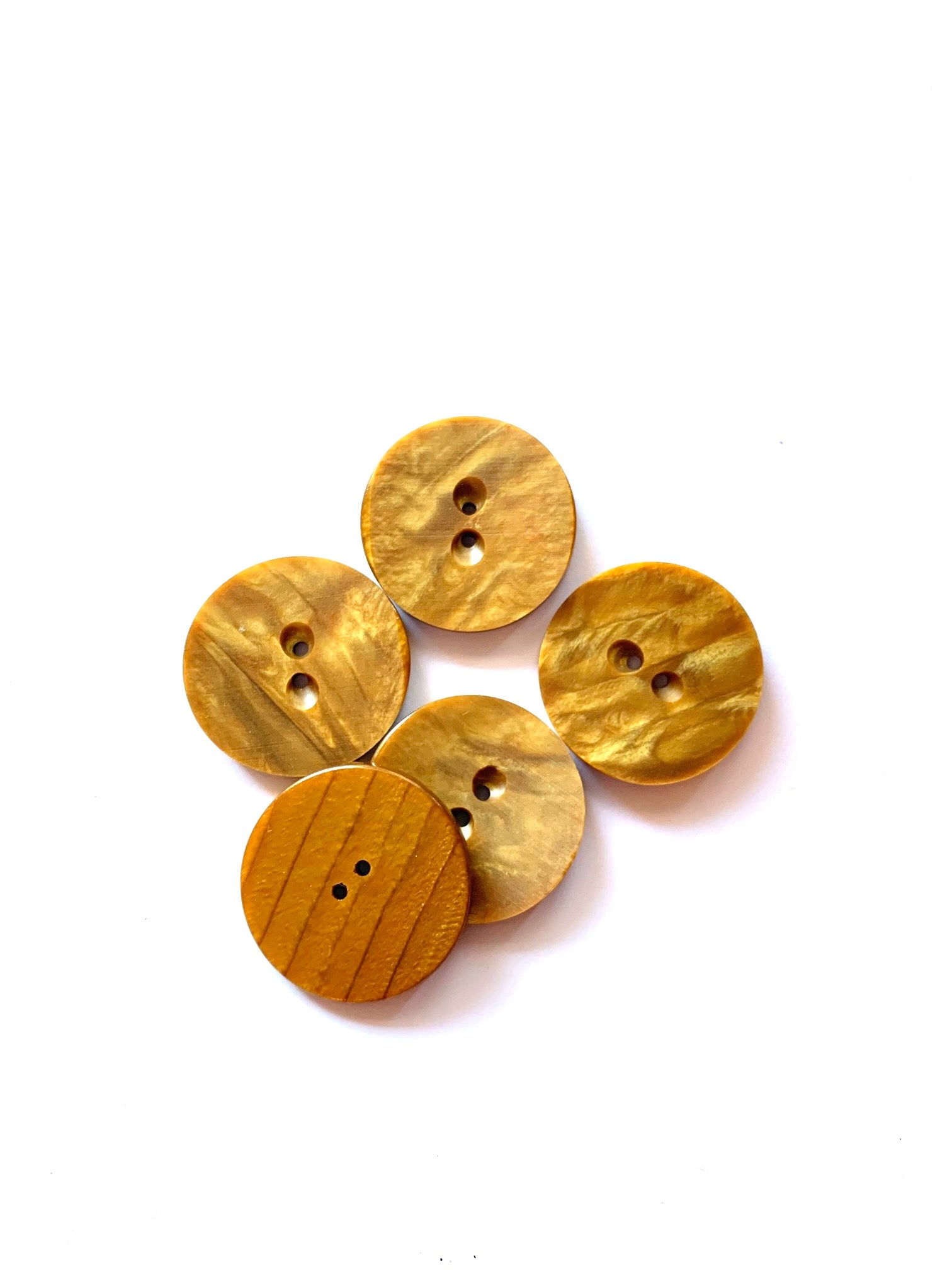Keltainen muovinappi. Halkaisija 3,4 cm.