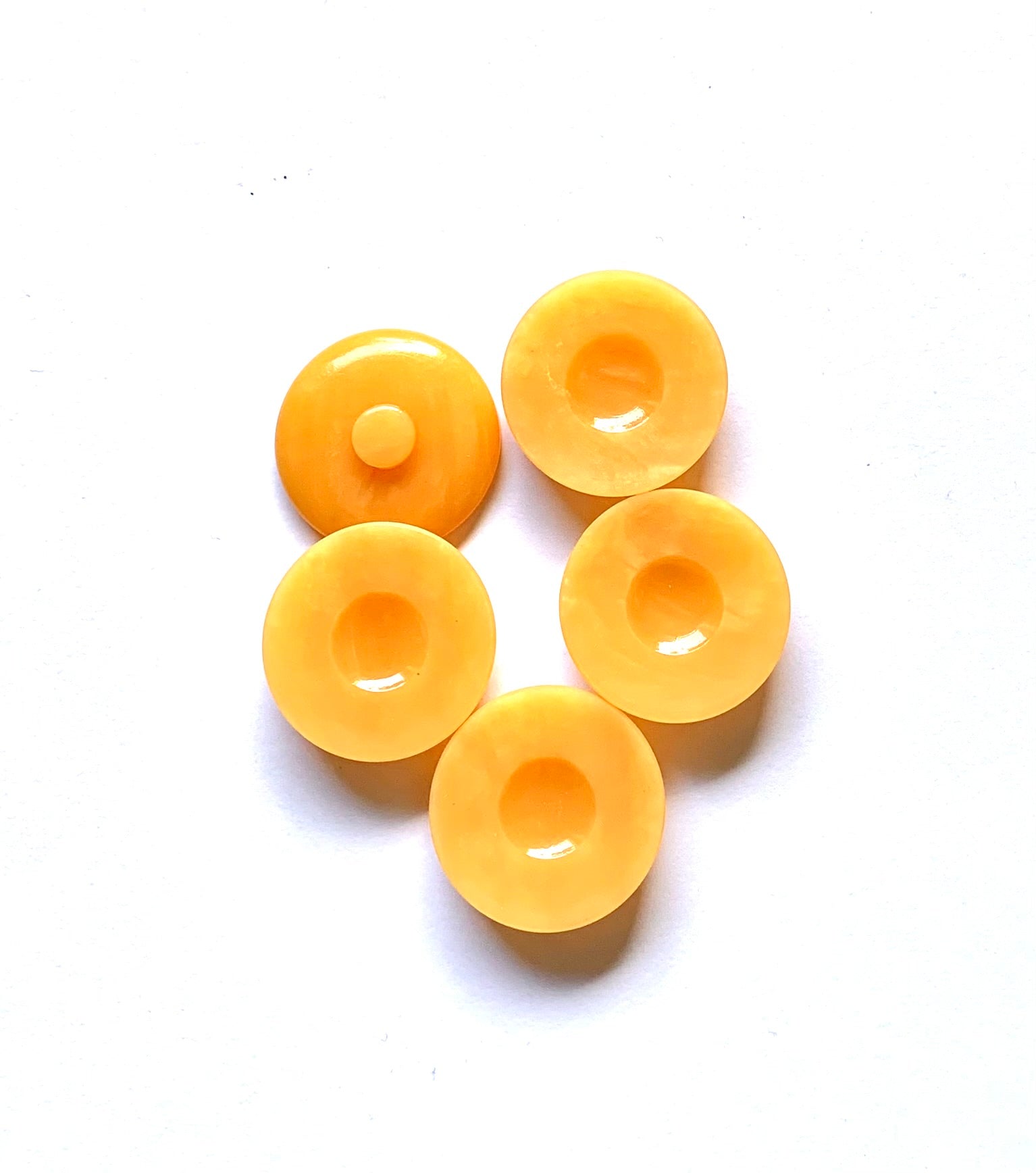 Keltainen muovinappi. Halkaisija 2,5 cm.