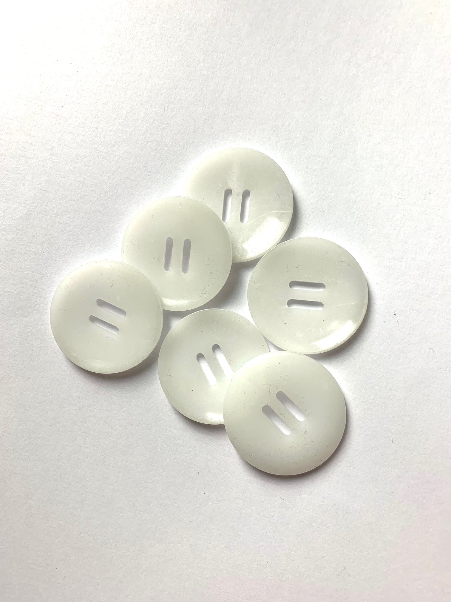 Valkoinen muovinappi. Halkaisija 3,6 cm.