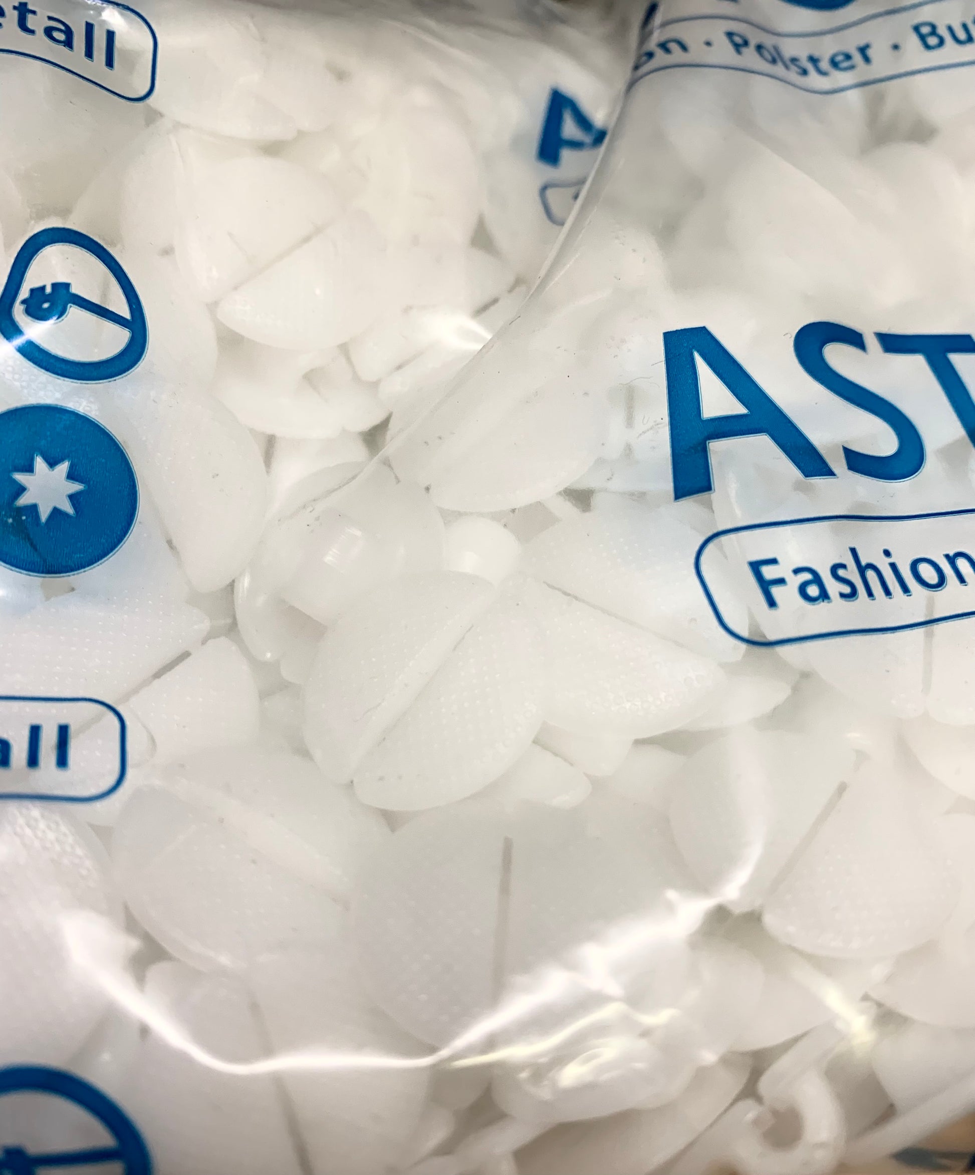 Valkoinen muovinappi, halkaisija 18 mm. Käytetään päällystettyjen nappien selkänappina. Napissa olevan uran ansiosta se on helppo käyttää, eikä sillä ole löystymisvaaraa.